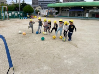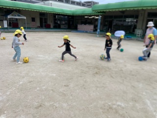 年中・年長クラスは屋外で、ボール運動・サッカーを行いました。