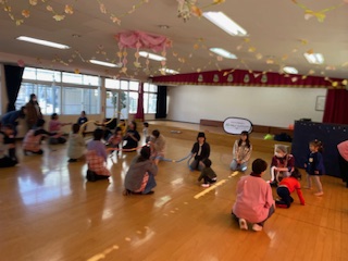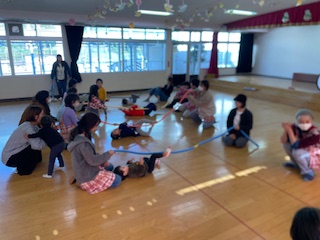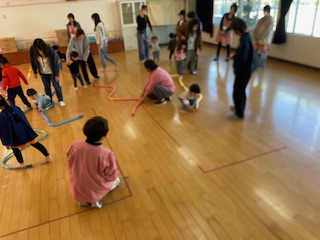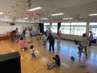 「未就園児の広場」では、前回にもみられた顔がたくさんありました。全員で楽しい運動あそびを行い、楽しい時間を過ごしました。